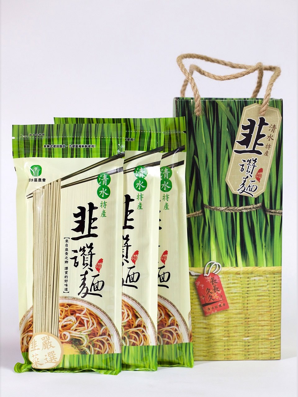 採用清水區當地韭菜,將其打汁後不經過過濾直接加入麵粉,讓麵粉有天然蔬菜纖維且更具特殊辛味韭香,爽口Q彈有嚼勁。