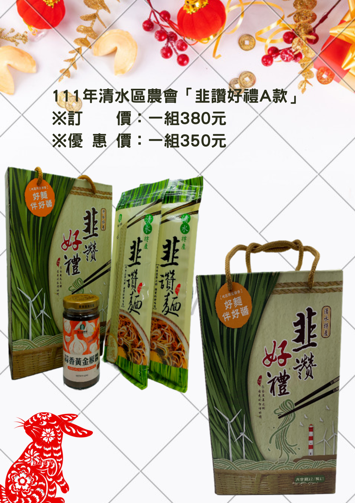 A款:韭讚麵(300g)*2包、蒜香黃金椒醬(220g)*1罐 B款:韭讚麵(300g)*2包、大醇釀極品醬油(320ml)*1罐 ※特價禮盒數量有限,欲訂購者請電洽! 訂購電話:04-26232101